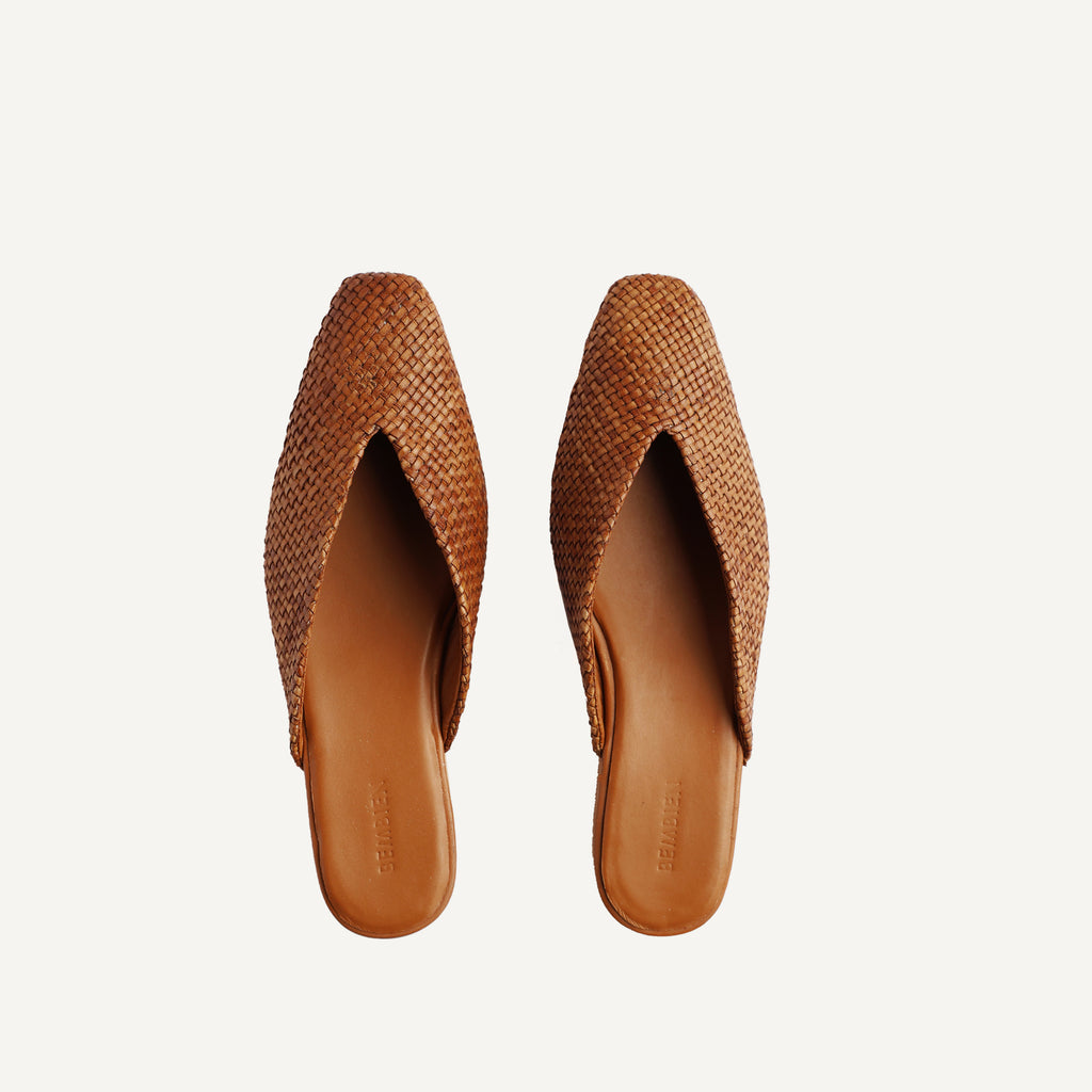 A pointed, square-toe mule with a v-cut shape that visually elongates the leg. Handcrafted in soft, woven leather. Features a low stacked heel to give you a little extra height and a padded sole for all-day comfort.