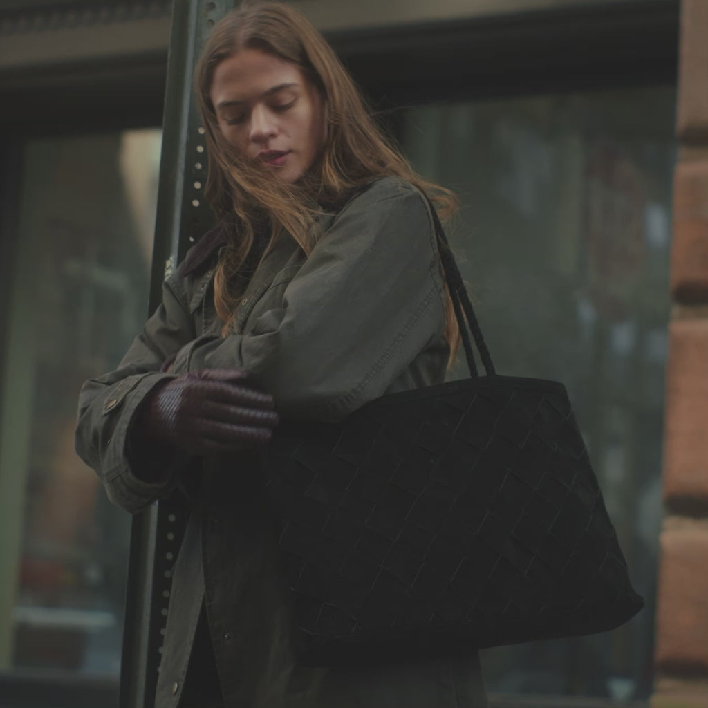 One of our largest tote bags. A versatile carryall tote in soft suede, handwoven in our popular Grande Weave. Gabrielle features two braided shoulder straps and a magnetic closure. The spacious size holds a 16” laptop, water bottle, and change of shoes, perfect for work and travel.