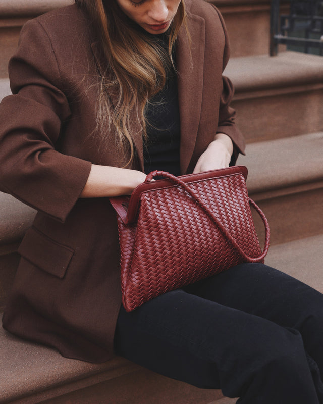 A chic day bag handcrafted in woven leather, and the larger format of our all-time bestselling Le Sac. The slouchy silhouette features a structured top frame with a magnetic closure and braided shoulder strap. It holds your phone and card case.