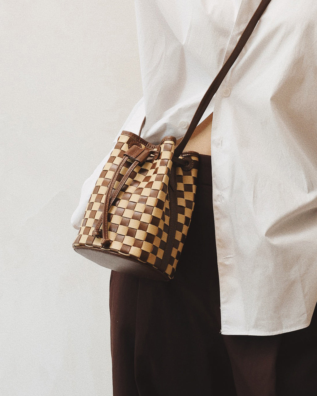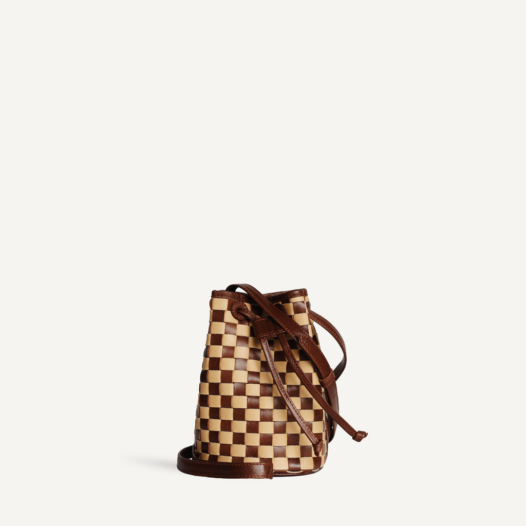 Mini, vintage-inspired bucket bag in handwoven carré check leather. It features a long, adjustable shoulder strap and drawstring closure.