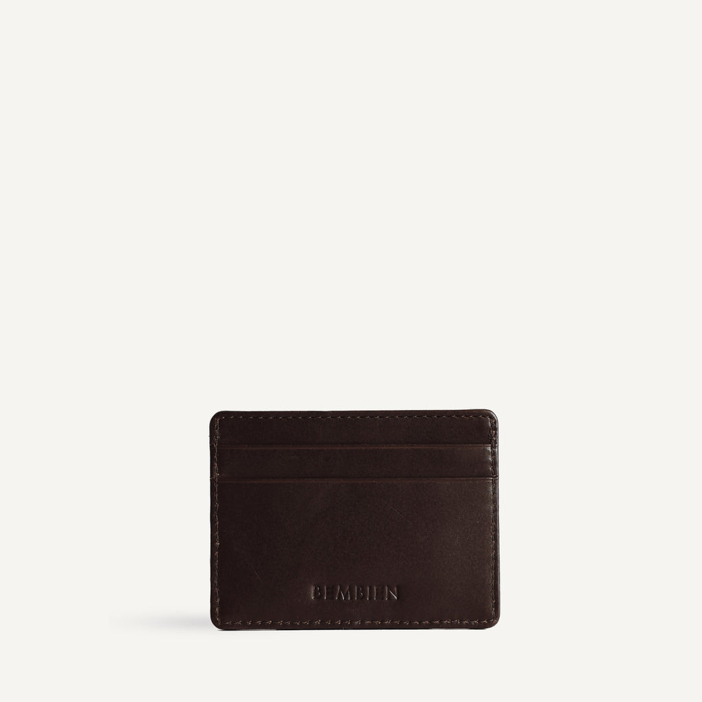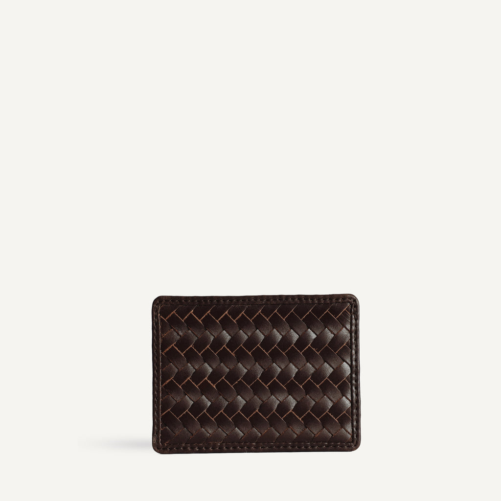 A slim, minimalist card case to hold your essentials. Made in handwoven leather and features two card slots and a pocket for loose bills.