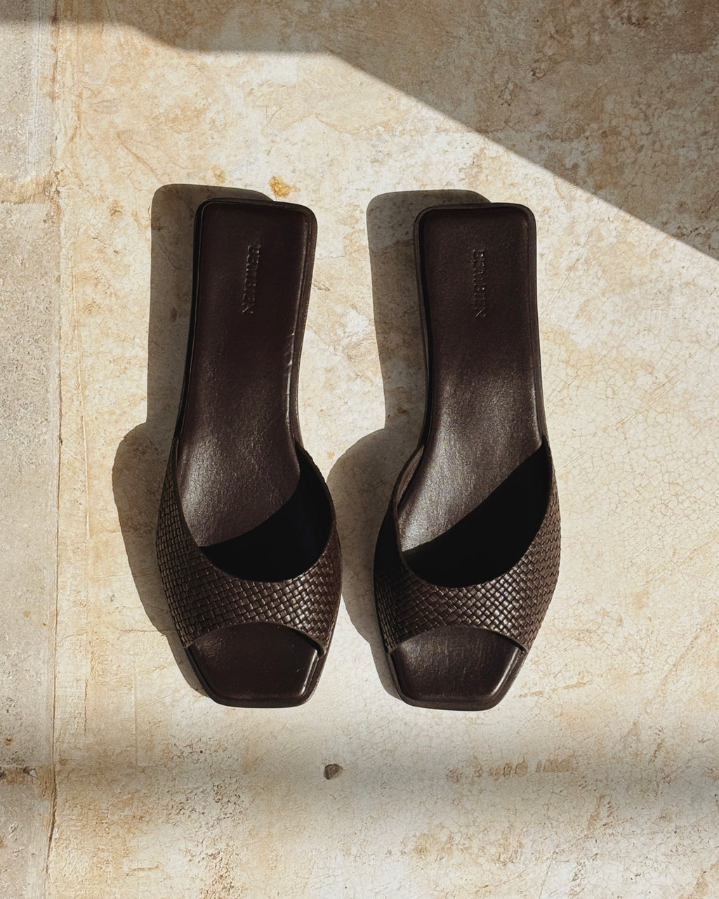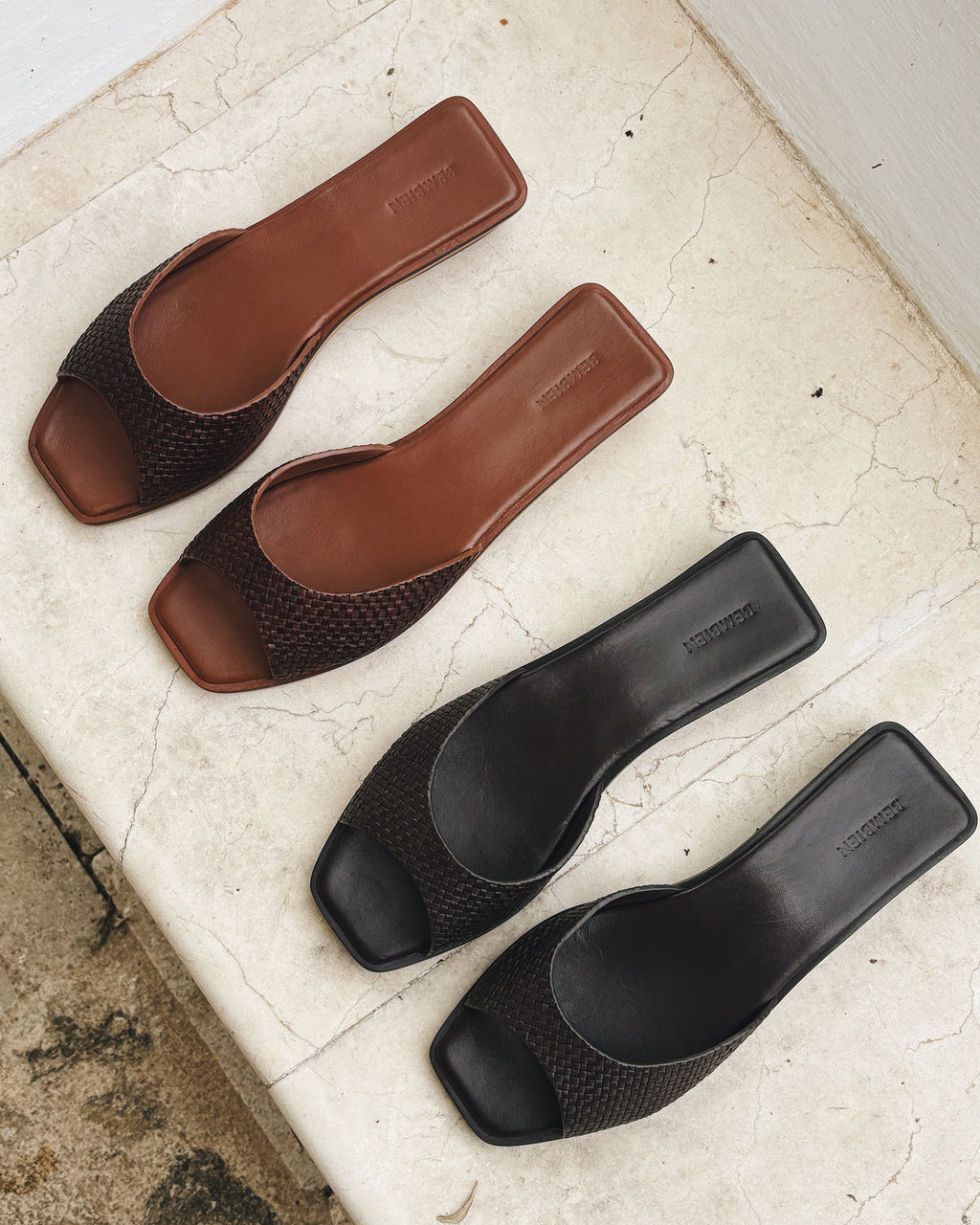 Slim angular strap slide designed to visually elongate the leg. Handcrafted in our woven leather. It features a petite stacked heel to give you a little extra height and a padded insole for all-day comfort