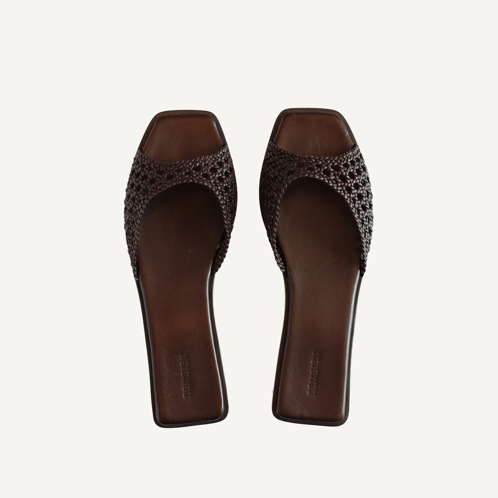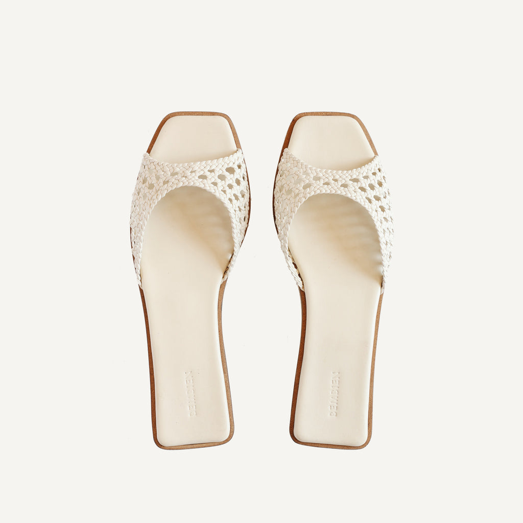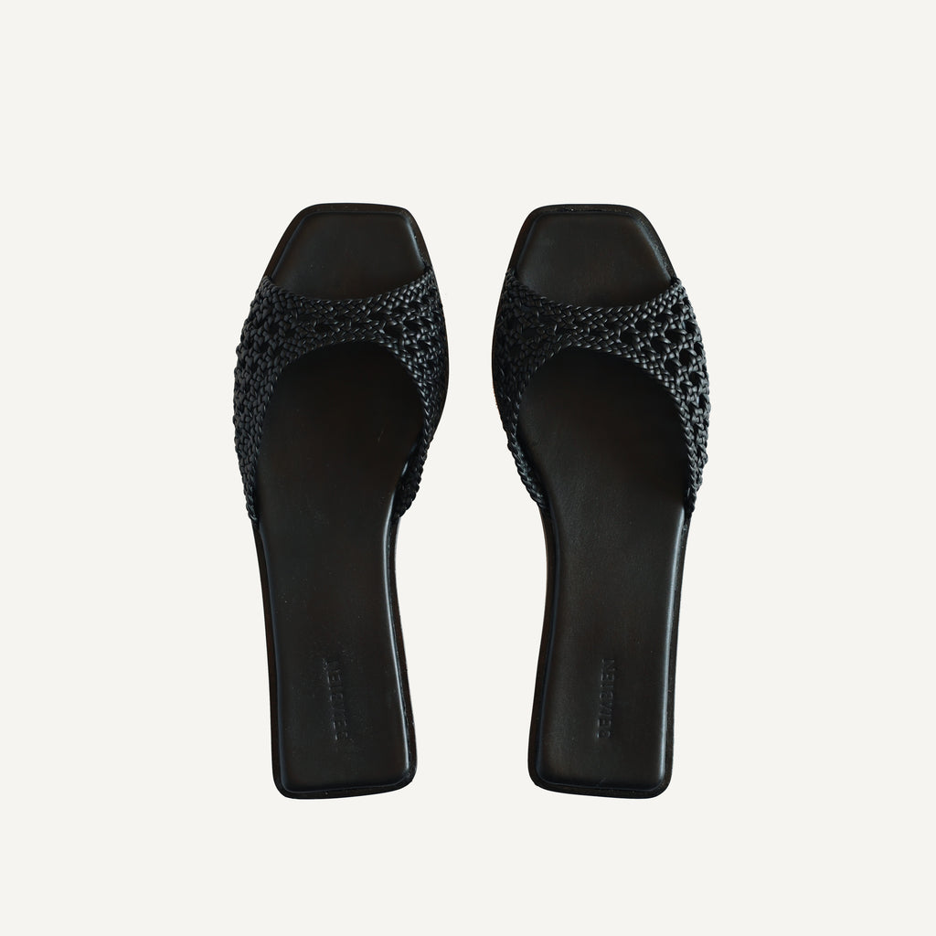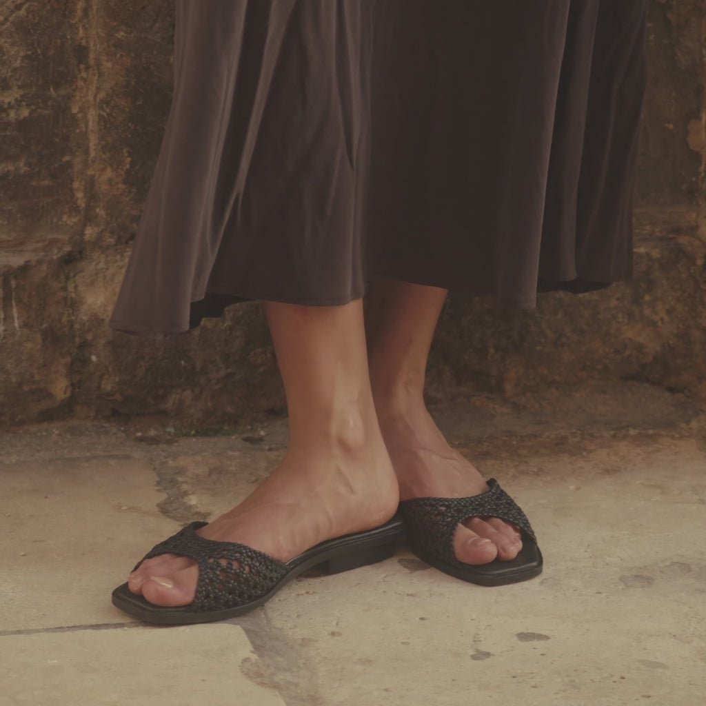 Slim angular strap slide designed to visually elongate the leg. Handcrafted in our open net weave leather. It features a petite stacked heel to give you a little extra height and a padded insole for all-day comfort.