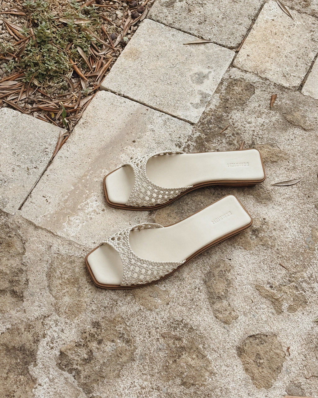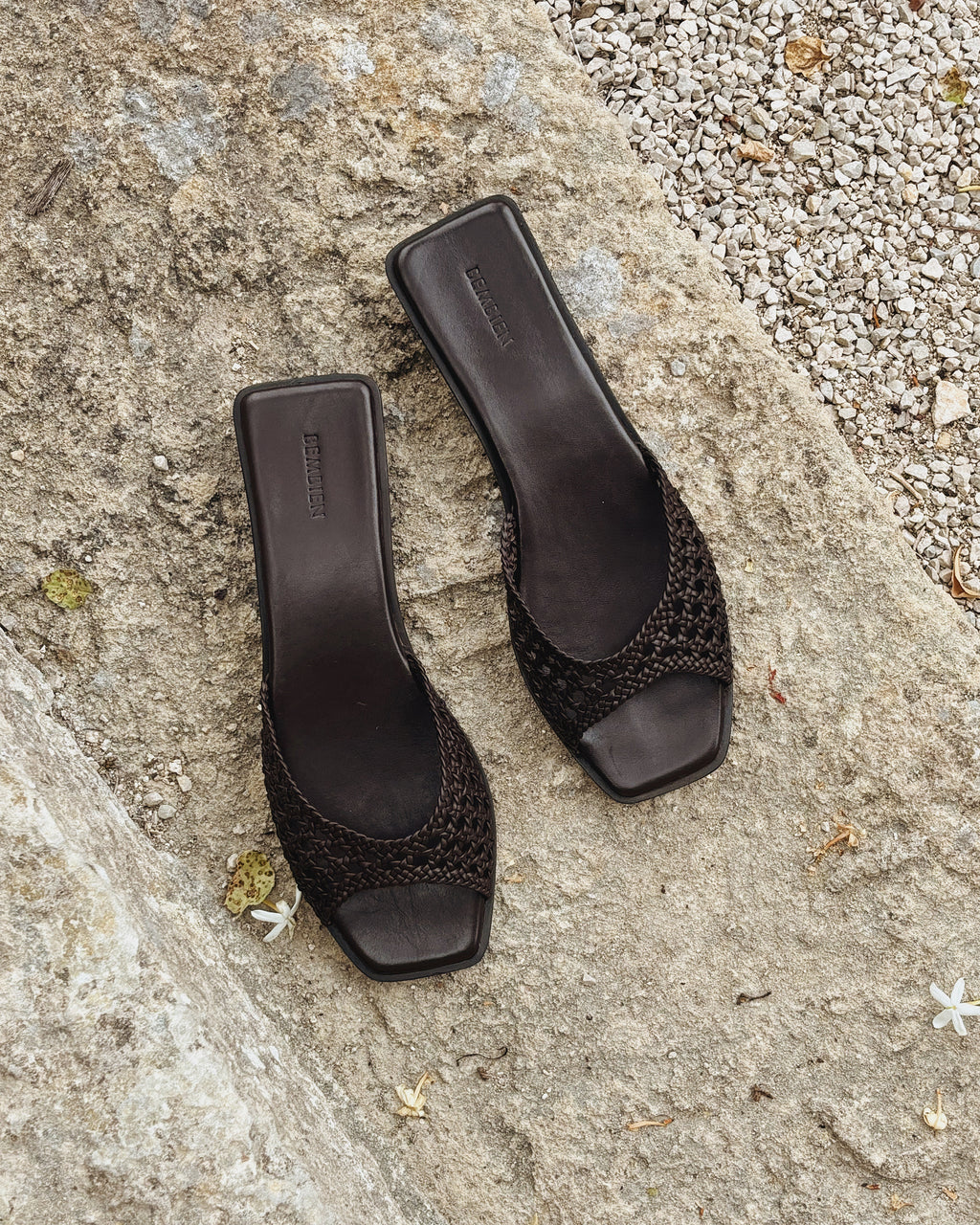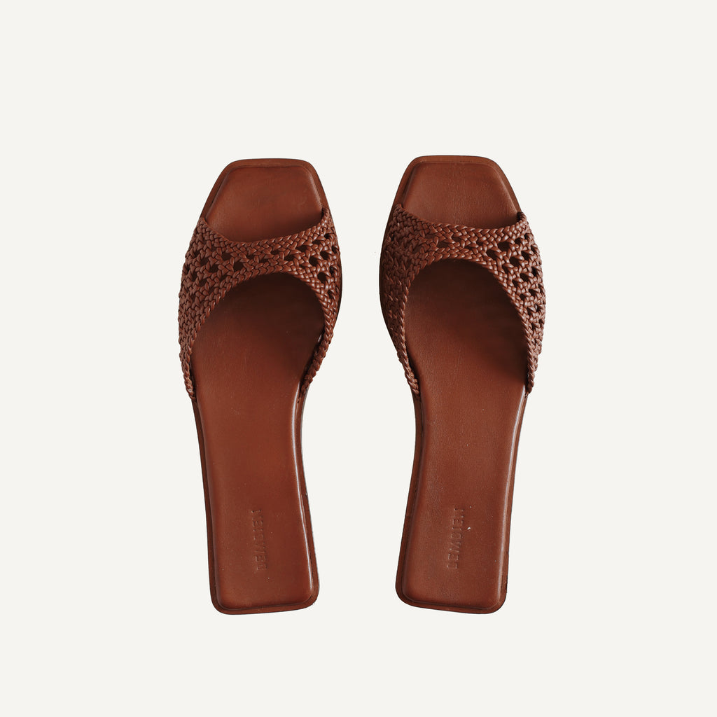 Slim angular strap slide designed to visually elongate the leg. Handcrafted in our open net weave leather. It features a petite stacked heel to give you a little extra height and a padded insole for all-day comfort.