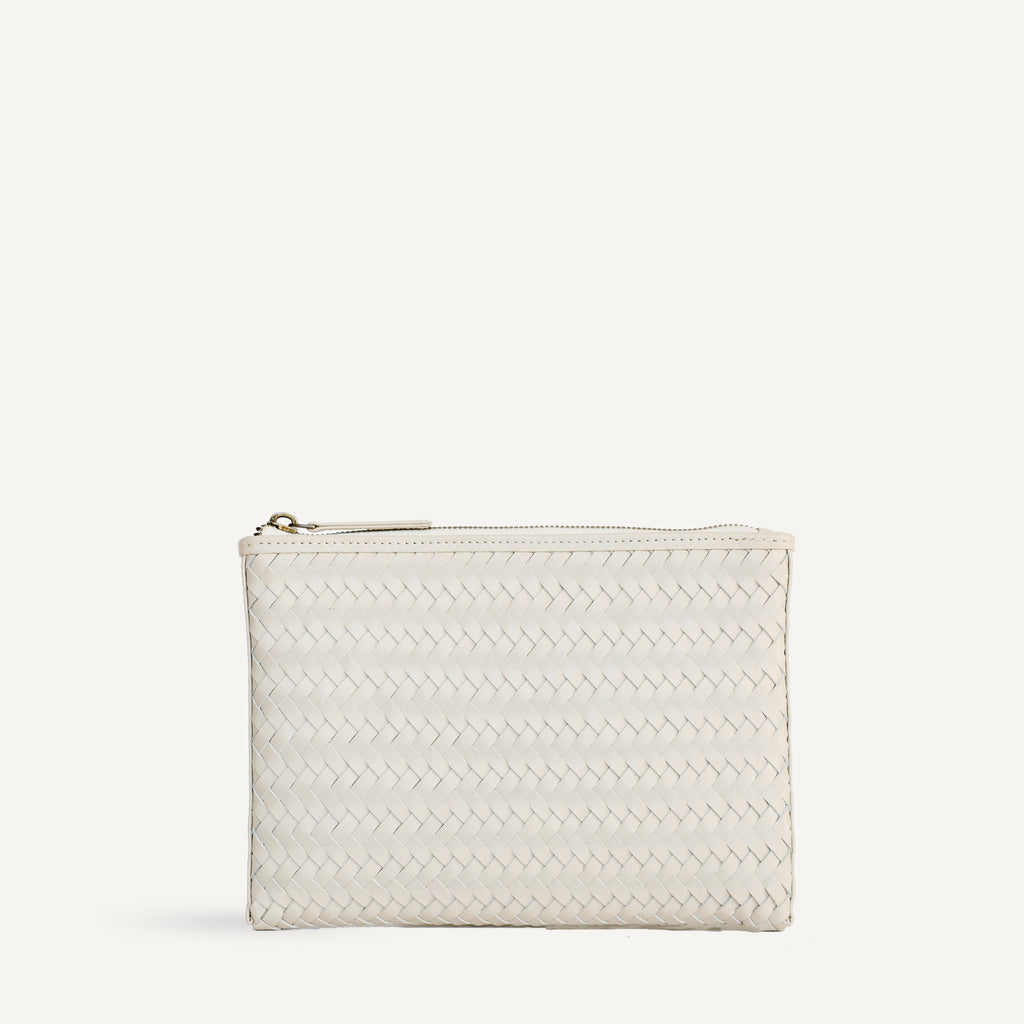 A practical zip pouch in handwoven leather. The spacious size is perfect for keeping organized in a larger work tote or during travel.