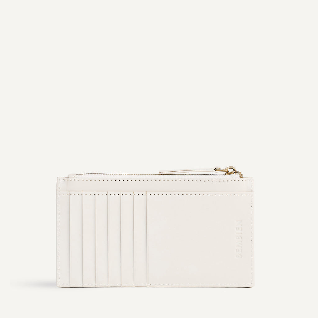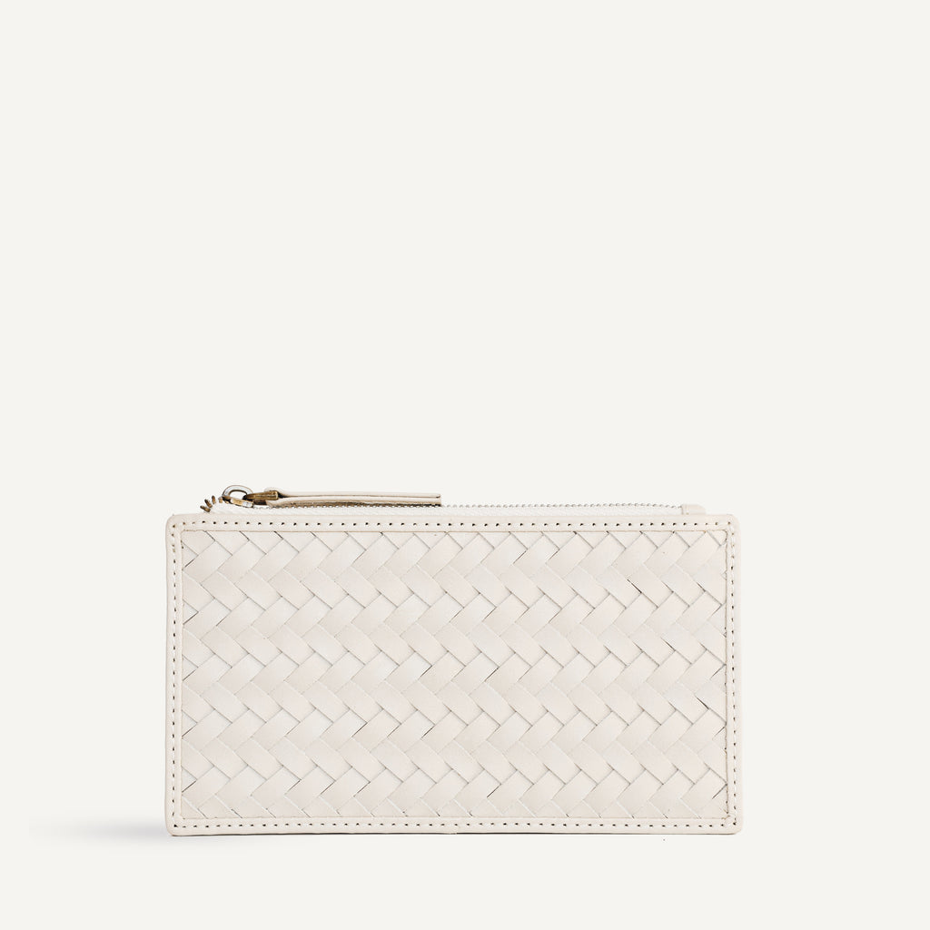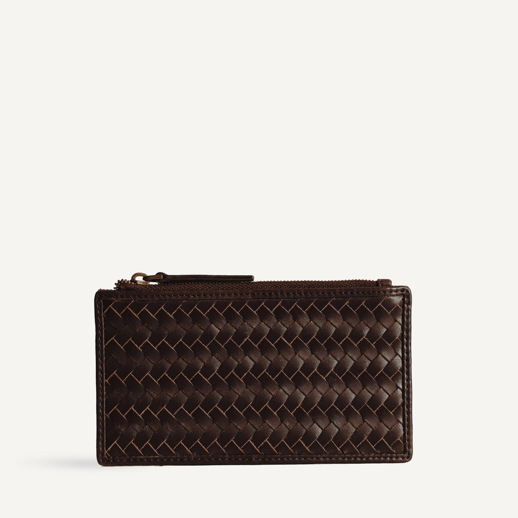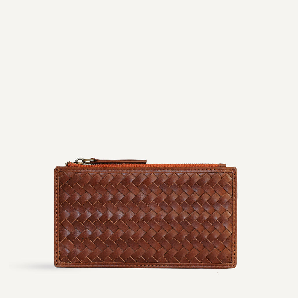A slim, minimalist card case with a little extra room. Made in handwoven leather and features seven card slots, a pocket, and a zip pouch for loose change.