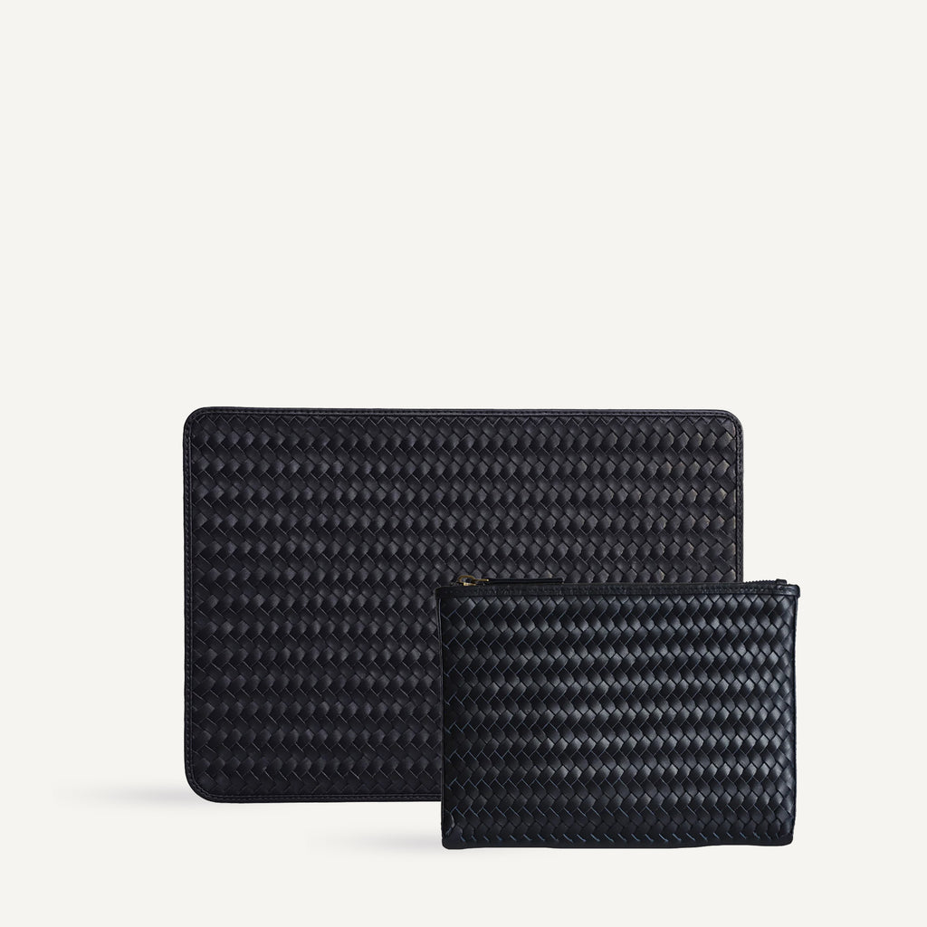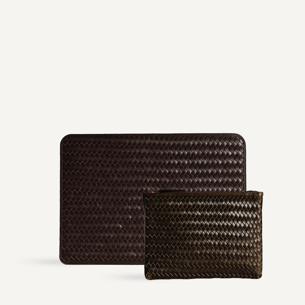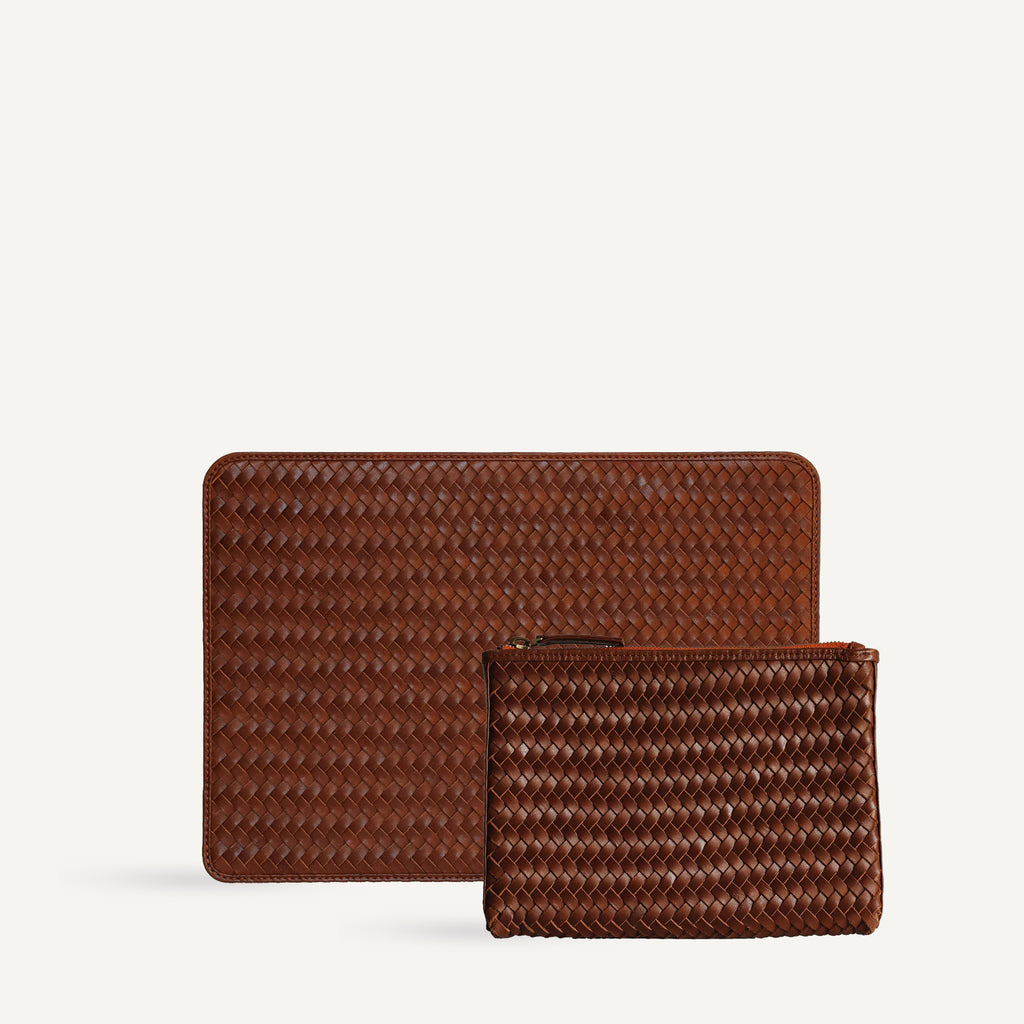 A pair of our bestselling work essentials: our Lia Laptop Case and Noa Zip are made from handwoven leather to elevate your workday.